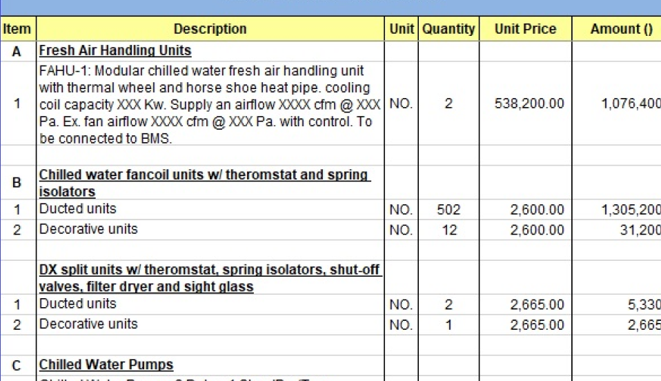 HVAC/R BOQ, stating the quality and quantity of chiller, pipes, ducts etc. required at optimum cost.